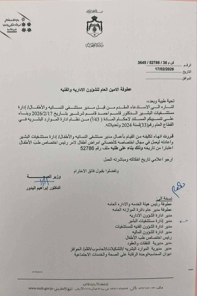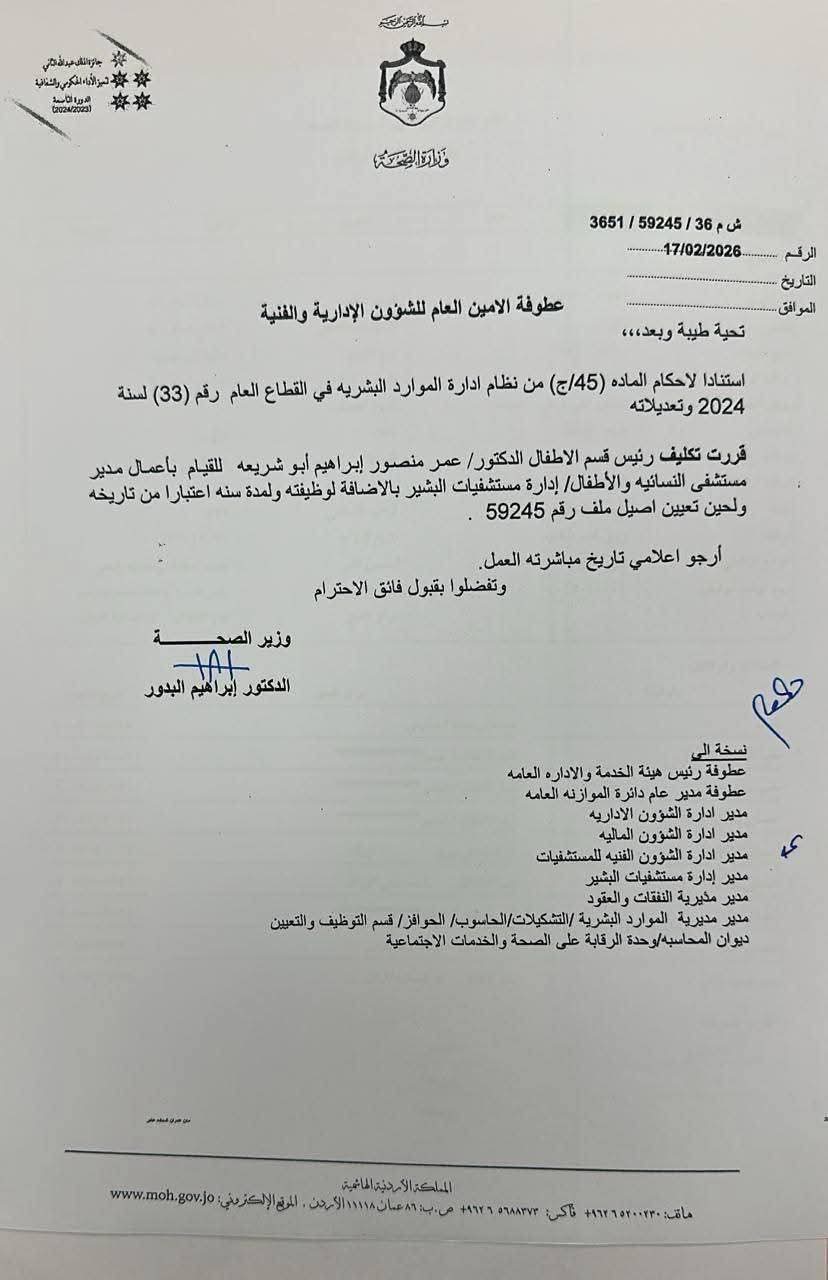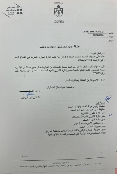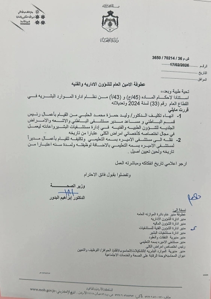 شهدت وزارة الصحة الأردنية اليوم سلسلة من التغييرات الإدارية في مواقع الصفوف الأولى، في خطوة وُصفت بأنها امتداد طبيعي للمسار الإصلاحي الذي يقوده معالي وزير الصحة الدكتور إبراهيم البدور منذ توليه مهامه.