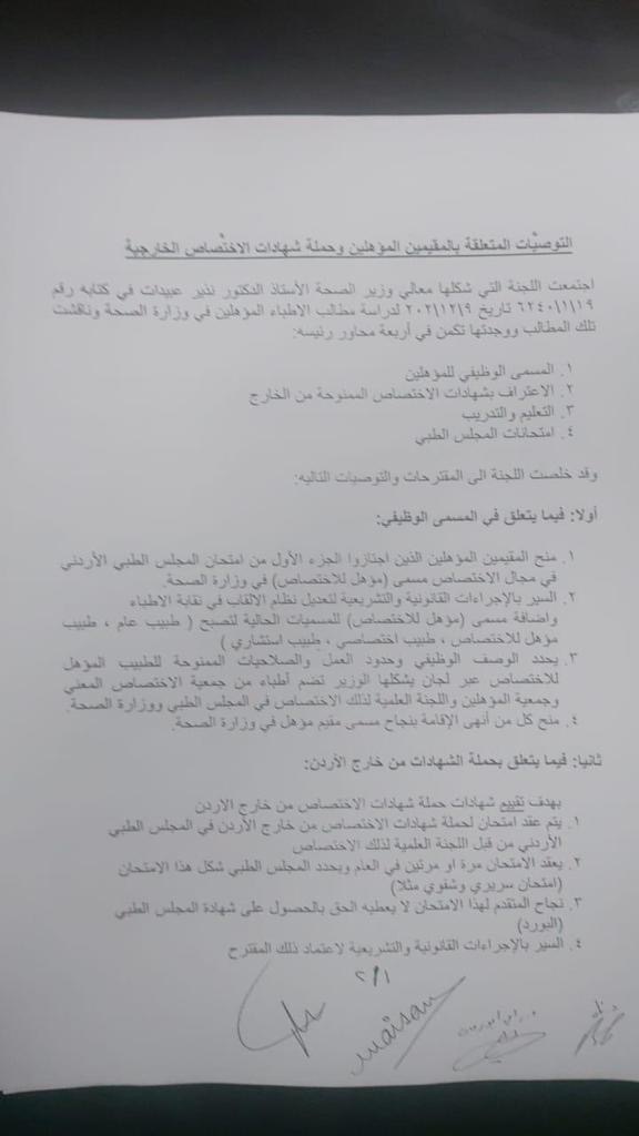 في عهد معالي وزير الصحة الأسبق نذير عبيدات، شُكِّلت لجنة نقابية–وزارية لمعالجة ملف الأطباء المؤهلين وحملة البورد الأجنبي، وهو ملف طال انتظاره وتراكمت تداعياته لسنوات. وقد خرجت اللجنة — بحسب ما أُعلن حينها — بتوصيات وُصفت بالتاريخية، تضمنت رؤية واضحة ومتكاملة لحل الملف، وأقرت لقب «مؤهل اختصاص» كإطار تنظيمي وقانوني يعالج إشكاليات الاعتراف بالمؤهلات الأجنبية وينظم المسار المهني لتلك الفئة.