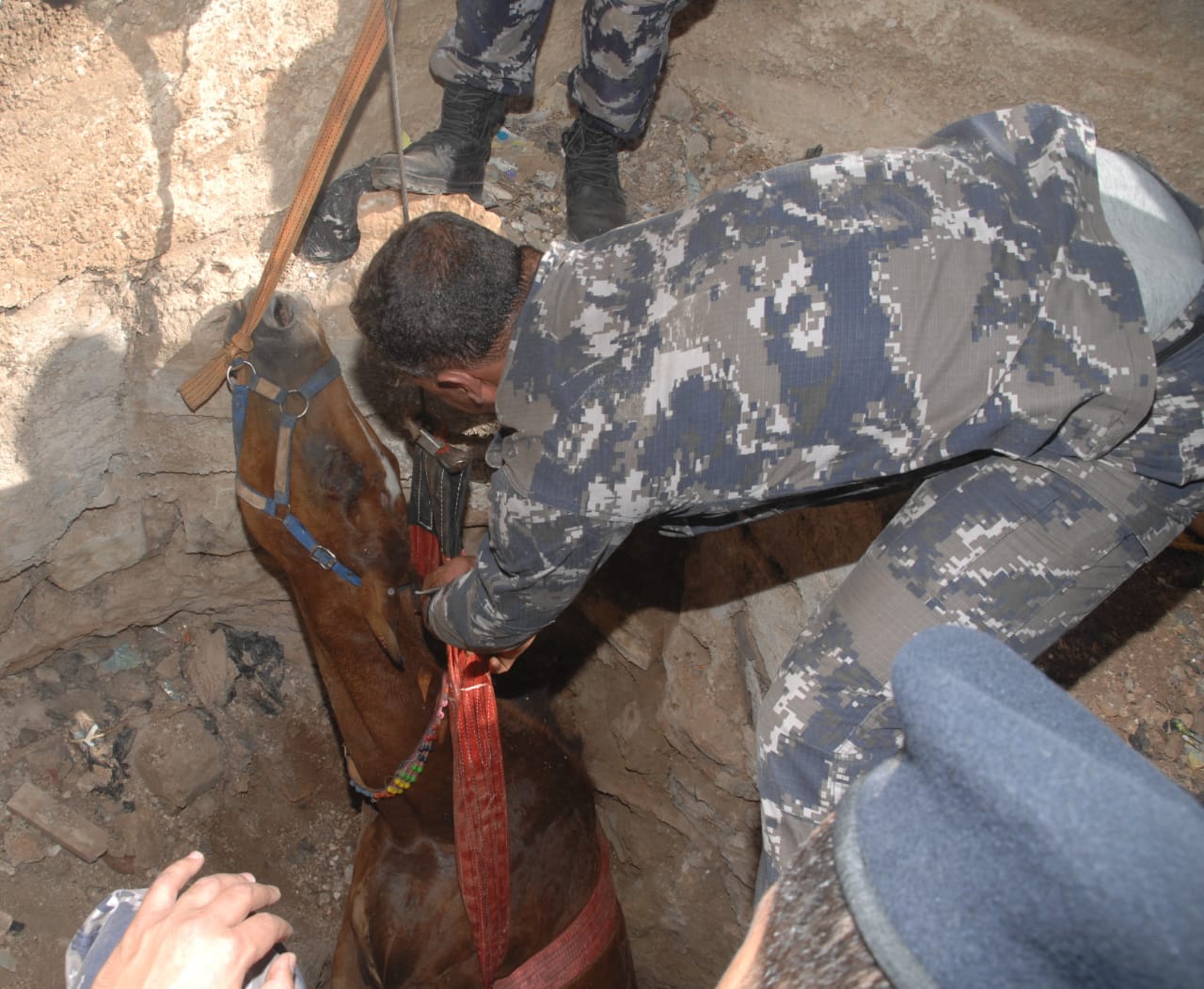 وقالت إدارة الإعلام أن فرق الإنقاذ عملت على إخراج الحصان من داخل الحفرة باستخدام الآليات الثقيلة والمعدات المتخصصة بمثل هذه الحوادث دون أن يصاب بأي أذى .