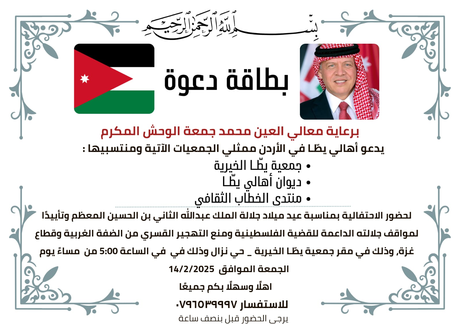 احتفال أهالي يطأ برعاية العين الوحش .. تأييداً لمواقف الملك اتجاه القضية الفلسطينية واحتفاءً بعيد ميلاد جلالته