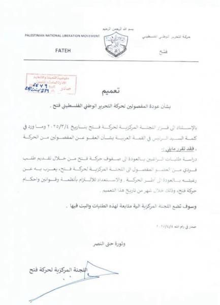 تعميم بشأن عودة المفصولين لحركة فتح
