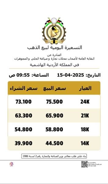 كما بلغت أسعار بيع الغرامات من الذهب عيار 24 و18 و14 لدى محال الصاغة 75.5 دينارا و58.8 دينارا و44.5 دينارا على التوالي.