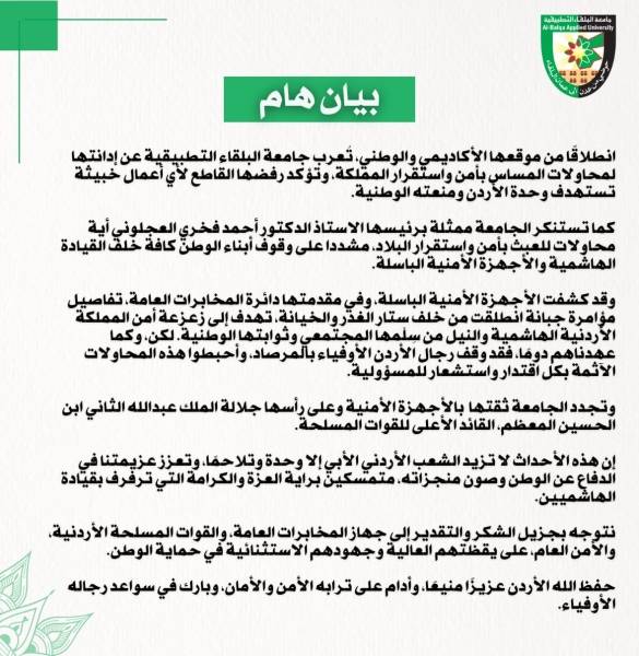 انطلاقًا من موقعها الأكاديمي والوطني، تُعرب جامعة البلقاء التطبيقية عن إدانتها لمحاولات المساس بأمن واستقرار المملكة، وتؤكد رفضها القاطع لأي أعمال خبيثة تستهدف وحدة الأردن ومنعته الوطنية.