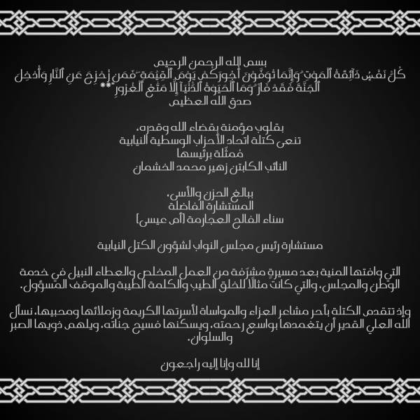 التي وافتها المنية بعد مسيرةٍ مشرّفة من العمل المخلص والعطاء النبيل في خدمة الوطن والمجلس، والتي كانت مثالًا للخلق الطيب والكلمة الطيبة والموقف المسؤول.
