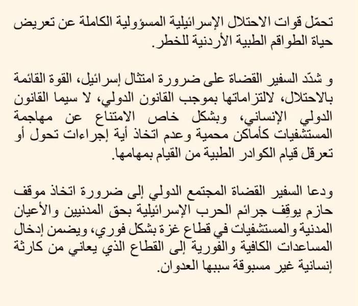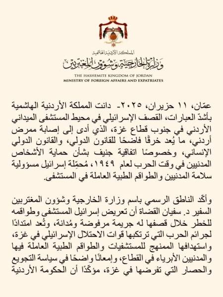 وأكّد الناطق الرسمي باسم وزارة الخارجية وشؤون المغتربين السفير د. سفيان القضاة أن تعريض إسرائيل المستشفى وطواقمه للخطر خلال قصفها له جريمة مرفوضة ومُدانة، وتُعد امتدادًا لجرائم الحرب التي ترتكبها قوات الاحتلال الإسرائيلي في غزة، واستهدافها الممنهج للمستشفيات والطواقم الطبية العاملة فيها والمدنيين الأبرياء في القطاع، وإمعانًا واضحًا في سياسة التجويع والحصار التي تفرضها في غزة، مؤكّدًا أن الحكومة الأردنية تحمّل قوات الاحتلال الإسرائيلية المسؤولية الكاملة عن تعريض حياة الطواقم الطبية الأردنية للخطر.