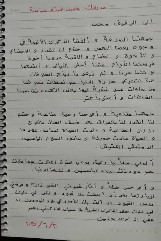 وجاء في الرسالة المكتوبة بخط اليد، أن الصداقة التي جمعتهما كانت مليئة بالذكريات، واللقمة، والعمل، والتعب، والضحكات، مؤكدًا أن الفراق كان صعبًا وأن الحياة فقدت شيئًا من طعمها برحيله.