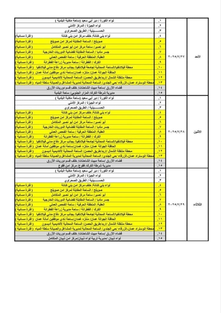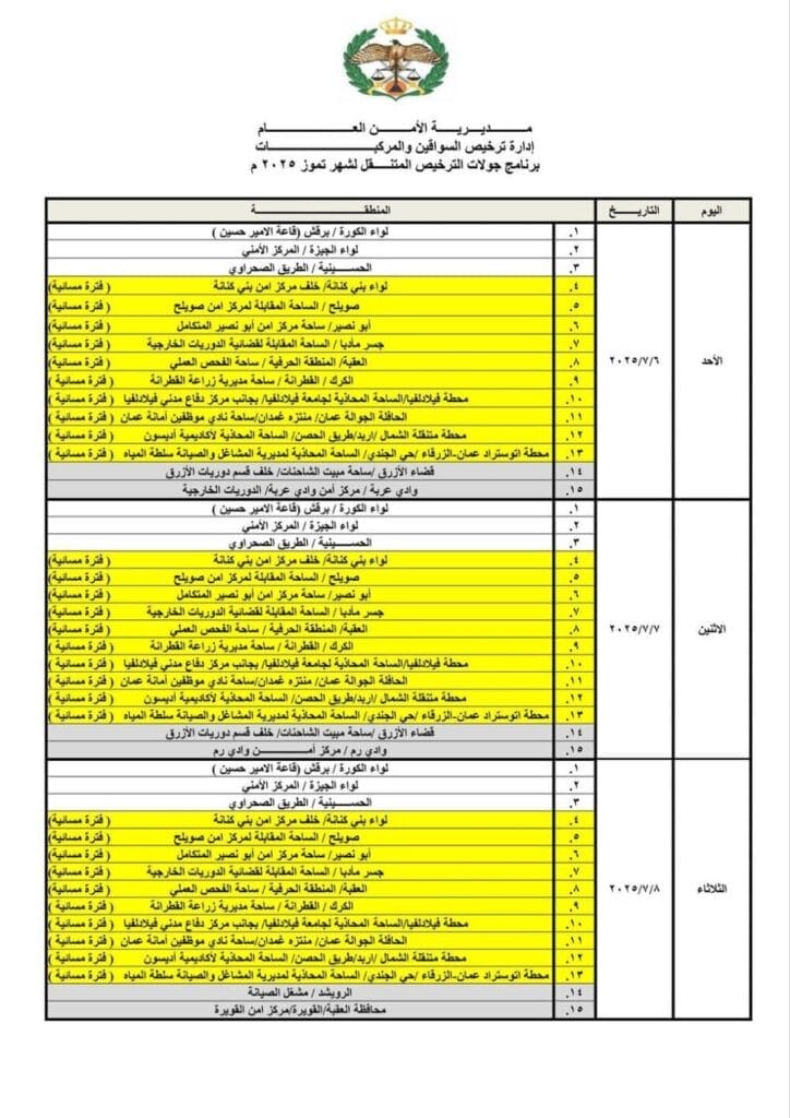 اعلنت مديرية الأمن العام ، برنامج الترخيص المتنقل لشهر تموز لعام 2025 في عدد من مناطق المملكة، حيث ستكون ساعات الدوام الصباحي من يوم الأحد ولغاية يوم الأربعاء من الساعة 8:00 صباحًا وحتى الساعة 2:00 ظهرًا، ويوم الخميس من الساعة 8:00 صباحًا ولغاية الساعة 1:00 ظهرًا.