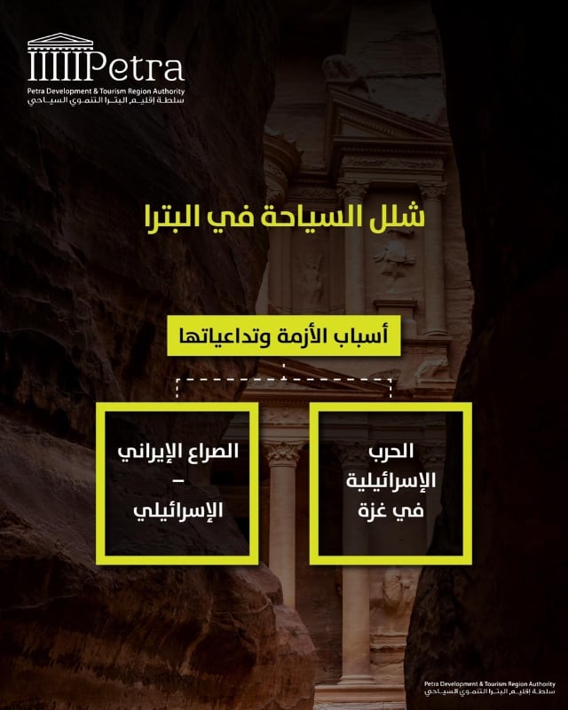 ويواجه القطاع السياحي في البترا، المدينة الأشهر بين المواقع الأثرية والسياحية الأردنية، أزمة غير مسبوقة إذ أغلقت العديد من منشآته أبوابها، وسط آمال بانفراجة قريبة للأزمة الإقليمية، بما يُعيد للبترا بريقها السياحي المعتاد، وينعش القطاعات الاقتصادية المرتبطة بها، والتي تسهم بشكل مباشر في الناتج المحلي الإجمالي، وتوفّر مئات فرص العمل، وتدعم استثمارات محلية تُقدّر بنحو نصف مليار دينار، يعود معظمها لأبناء المنطقة.
