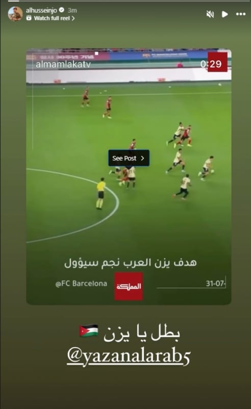 أعاد الامير الحسين بن عبدالله الثاني، ولي العهد، نشر هدف نجم منتخب النشامى ونادي سيؤول الكوري الجنوبي يزن العرب بمرمى نادي برشلونة الإسباني.