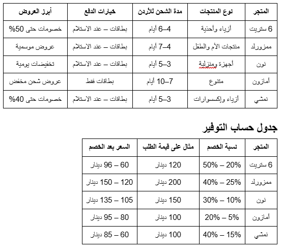 التسوق أونلاين في الأردن لم يعد رفاهية، بل وسيلة ذكية للحصول على أفضل المنتجات بأسعار منافسة، من خلال المقارنة بين المواقع برزت خيارات مفضلة بين المستخدمين، خاصة مع إمكانية الاستفادة من أكواد الخصم لزيادة التوفير. إذا كنت تبحث عن تجربة شراء سهلة وموثوقة، ابدأ الآن بمقارنة هذه المواقع واستغلال العروض المتاحة.