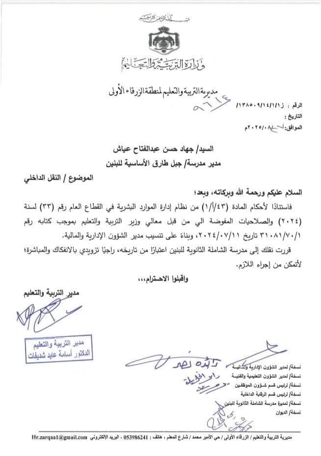 ويسرني أن أعلن انتقالي إلى مدرسة الشاملة الثانوية للبنين وأدعو الله أن يوفقني في مسيرتي القادمة وأن يجعلها خطوةً مباركة في خدمة أبنائنا الطلبة تحت ظل الراية الهاشمية.