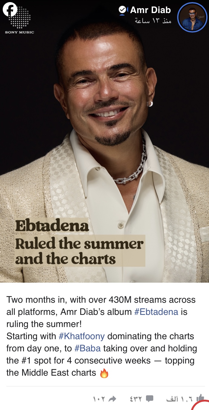 وعلّق عمرو على الصورة قائلاً: "بعد شهرين، ومع أكثر من 430 مليون استماع عبر جميع المنصات، يسيطر ألبوم عمرو دياب ابتدينا على قوائم الأغاني الصيفية، بدءًا من خطفوني الذي هيمن على القوائم منذ اليوم الأول، وصولًا الى بابا الذي تصدر قوائم الأغاني في الشرق الأوسط لأربعة أسابيع متتالية