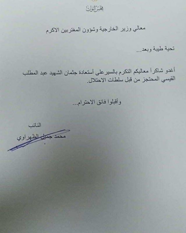 أغدو شاكراً معاليكم التكرم بالسير على استعادة جثمان الشهيد عبد المطلب القيسي المحتجز من قبل سلطات الاحتلال.
