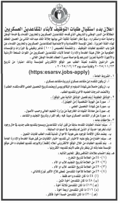 انطلاقاً من الدور الوطني والتاريخي الذي تقدمه المتقاعدون العسكريون والمحاربون القدماء في خدمة الوطن وحماية أمنه واستقراره، وطيّاً إطار العناية الملكية التي يوليها جلالة الملك عبدالله الثاني بن الحسين المعظم لهذه الفئة العزيزة، تعلن المؤسسة الاقتصادية والاجتماعية للمتقاعدين العسكريين والمحاربين القدماء عن فتح باب التقديم لطلبات التوظيف، وللتنمية تخصص (100) شاغر وظيفي في الوزارات والمؤسسات الحكومية من خلال هيئة الخدمة والإدارة العامة لأبناء المتقاعدين العسكريين من القوات المسلحة الأردنية والأجهزة الأمنية تعزيزاً لدورهم في مواصلة مسيرة العطاء لخدمة الوطن الغالي.