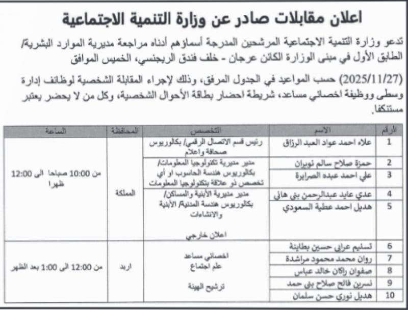 هذا، ودعت مؤسسات حكومية التالية أسماؤهم لإجراء المقابلة الشخصية:
