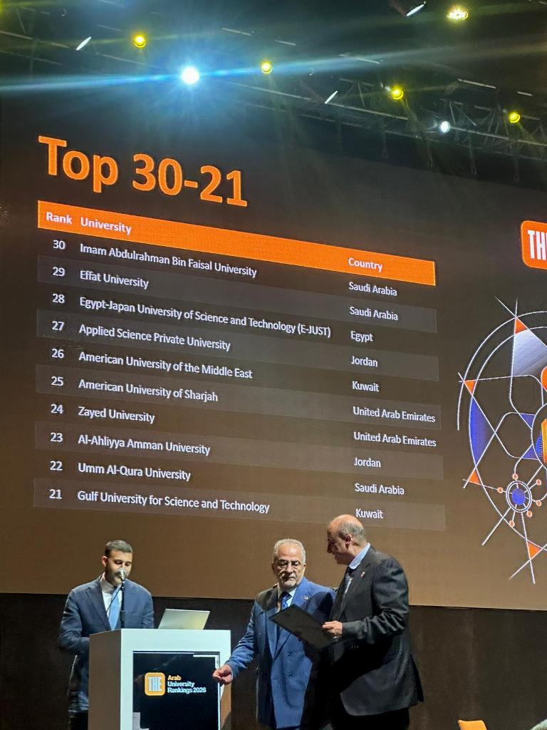 أعلنت مساء امس مع اختتام فعاليات اليوم الثاني لقمة تصنيف التايمز العربي 2025 ، نتائج تصنيف التايمز العربي 2025 ( من 21- 30) وذلك على هامش أعمال قمة التايمز للجامعات العربية التي استضافتها جامعة عمّان الأهليّة بالشراكة مع الجامعة الأردنية، والتي تُعقد لأول مرة في الأردن بمشاركة واسعة من ممثلي الجامعات العربية وخبراء التصنيفات العالمية.