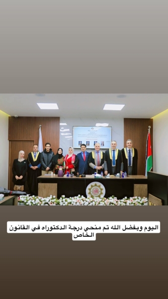 بمناسبة مناقشة رسالة الدكتوراه في القانون الخاص من جامعة العلوم الإسلامية العالمية، والموسومة بعنوان: