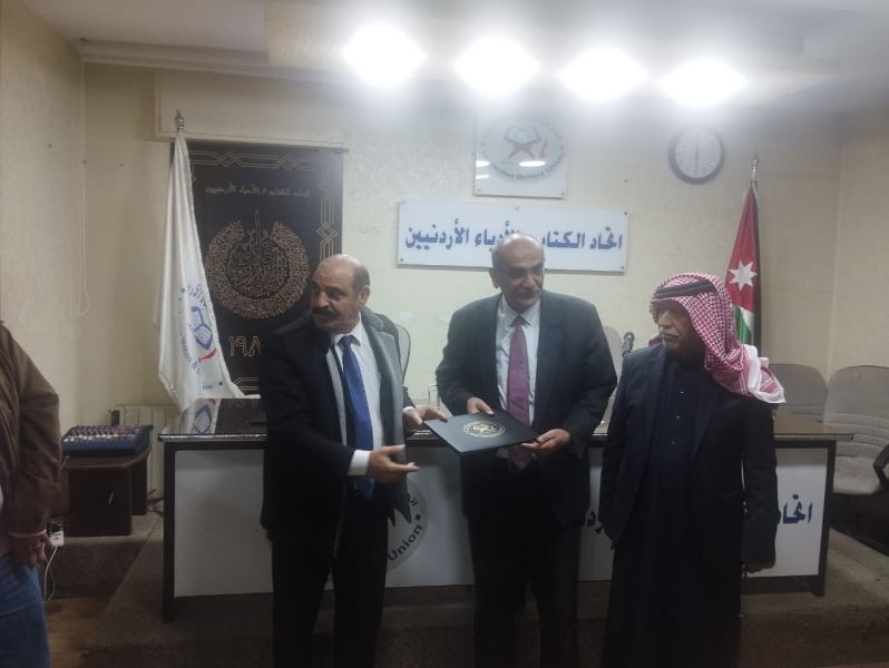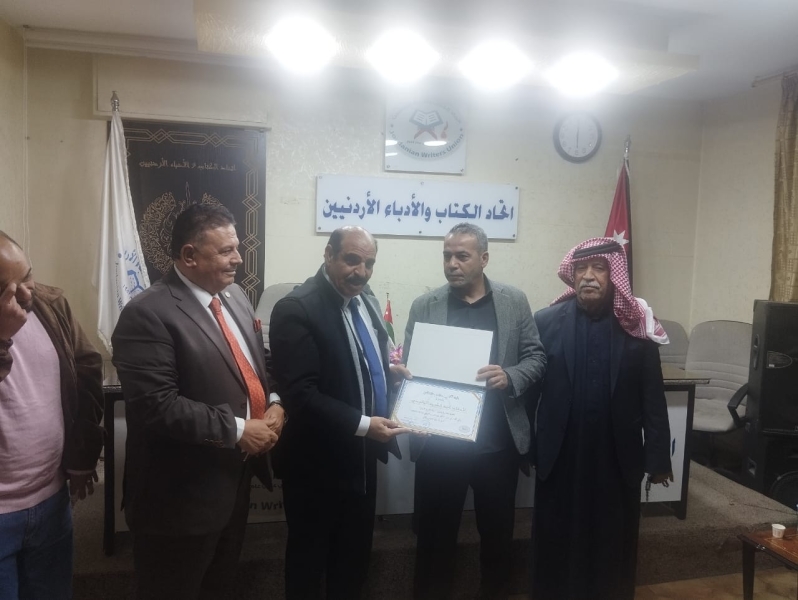 وفي نهاية المحاضرة قام رئيس اتحاد الكتاب سعادة الاستاذ الشاعر عليان العدوان بتكريم المشاركين بشهادتي تقدير وتم التقاط الصور التذكارية لهذه المحاضرة