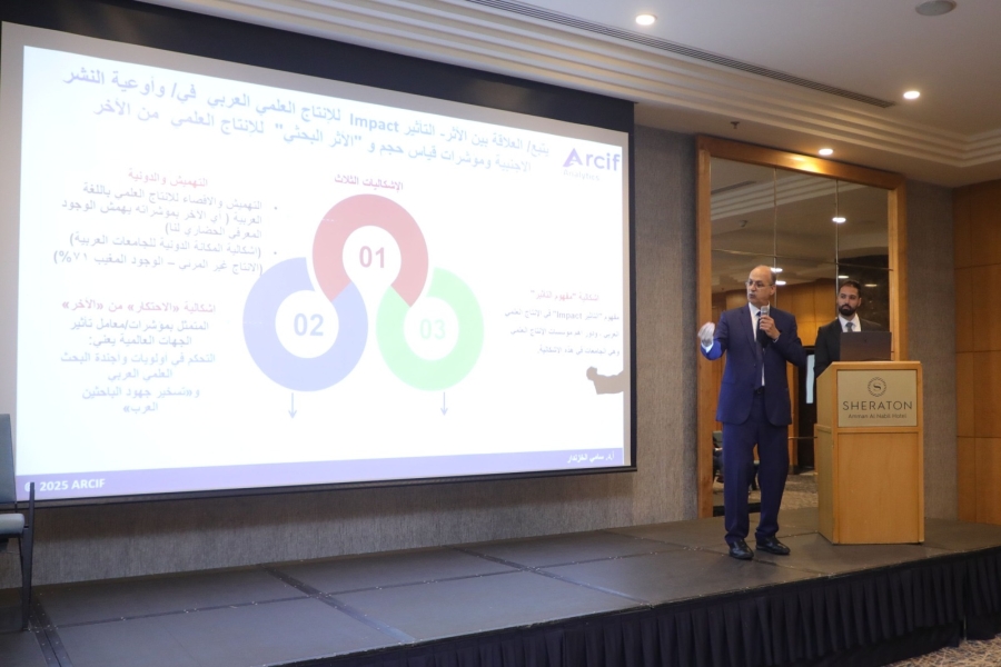 وأشار إلى حالة الأردن على سبيل المثال، موضحاً أنه عند مقارنة بيانات معامل «آرسيف» العربي ببيانات مؤشر «سكوبس» (Scopus) خلال الفترة 2012–2023، بلغ عدد المقالات باللغة العربية المستشهد بها في «آرسيف» أكثر من 8800 مقالة، حصدت ما يزيد على 42 ألف استشهاد، في حين لم يتجاوز عدد المقالات العربية في مؤشر «سكوبس» 1225 مقالة، وبعدد استشهادات بلغ 615 فقط، وهو ما يشكّل تغييباً مجحفاً بحق الجامعات الأردنية.