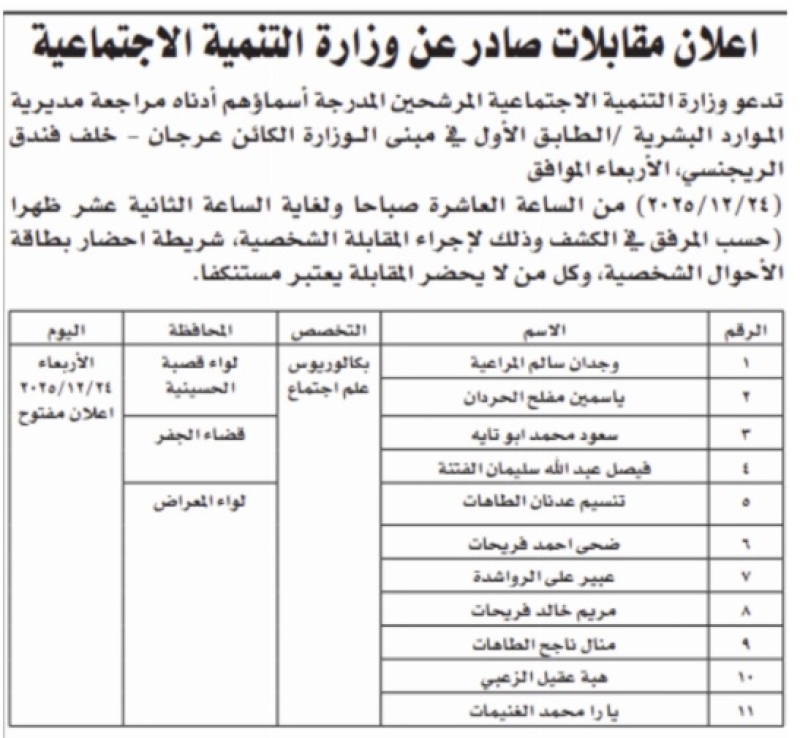 دعت وزارة التنمية الاجتماعية المرشحين المدرجة أسماؤهم أدناه مراجعة مديرية الموارد البشرية، الطابق الاول في مبنى الوزارة الكائن عرجان - خلف فندق الريجنسي يوم الاربعاء القادم، من الساعة العاشرة صباحا وحتى الثانية عشر ظهرا.
