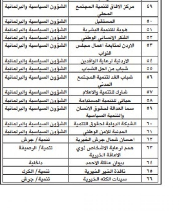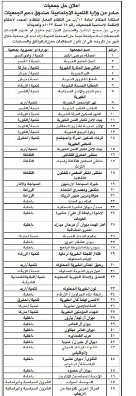 أعلنت وزارة التنمية الاجتماعية، من خلال صندوق دعم الجمعيات، عن حلّ 66 جمعية، وذلك استنادًا إلى أحكام المادة (11/ب) من النظام المعدّل للنظام المحدِّد لأحكام الأنظمة الأساسية للجمعيات رقم (25) لسنة 2023 وتعديلاته.