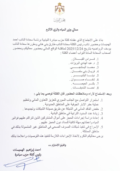من جهتهم، دعا اعضاء الكتلة، طارق بني هاني، عبد الهادي بريزات، فراس القبلان، يوسف الرواضية، محمد البستنجي، فريال بني سلمان، شفاء المقابلة، ودينا البشير، إلى إيجاد حلول للتحديات التي تواجه المواطنين خصوصًا في أدوار توزيع المياه، مطالبين بتشديد الرقابة على الاعتداءات على خطوط المياه وضرورة صيانة الشبكات للتقليل من نسب الفاقد.