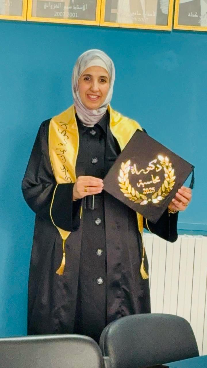 بمناسبه حصولها على درجة الدكتوراه بتقدير امتياز مع مرتبة الشرف من جامعة منوبة في الجمهورية التونسية، تخصص علوم التصرف والمحاسبة.