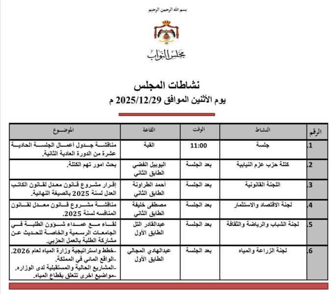 تناقش لجنة الزراعة والمياه في مجلس النواب، خلال اجتماع الاثنين، خطط واستراتيجية وزارة المياه للعام المقبل 2026، وذلك عقب الجلسة التشريعية للمجلس التي يناقش خلالها مشروع قانون معدل لقانون الأوقاف والشؤون والمقدسات الإسلامية.