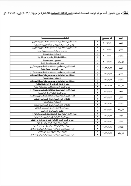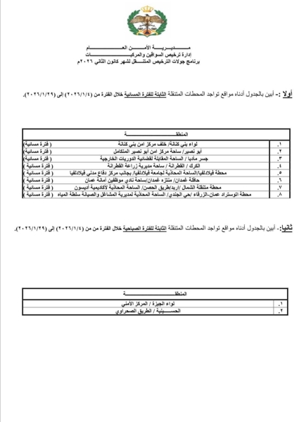 تعلن إدارة ترخيص السواقين والمركبات عن مواعيد العمل بجولات الترخيص المتنقل الصباحي والمسائي ضمن المبادرة الابتكارية ( بنوصلك ) خلال شهر كانون الثاني لعام 2026 في عدد من مناطق المملكة.
