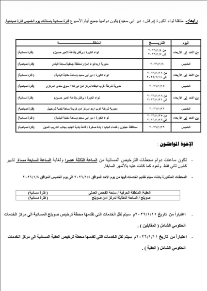 حيث ستكون ساعات الدوام الصباحي من يوم الأحد ولغاية يوم الأربعاء من الساعة 8:00 صباحًا وحتى الساعة 2:00 ظهرًا، ويوم الخميس من الساعة 8:00 صباحًا ولغاية الساعة 1:00 ظهرًا ودوام المحطات المسائية من الساعة 3:00 عصراً حتى الساعة 7:00 مساءً.