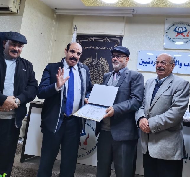 وفي ختام الأمسية، قدم رئيس اتحاد الكتّاب والأدباء الأردنيين شهادتي تكريم للمشاركٓين، تقديرًا لجهودهما وإسهاماتهما الثقافية، في أجواء احتفالية عكست تقدير الاتحاد للمبدعين ودورهم في إثراء الحياة الثقافية وتم التقاط الصور التذكارية لهذه الامسية .
