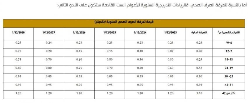 وتتضمن الخطة زيادات تدريجية سنوية على تعرفة المياه والصرف الصحي بمتوسط يبلغ 4.6%، تبدأ من كانون الأول 2023 وتستمر حتى كانون الأول 2028، على أن تنعكس على فواتير المشتركين تباعًا، وفق شرائح الاستهلاك المحددة.