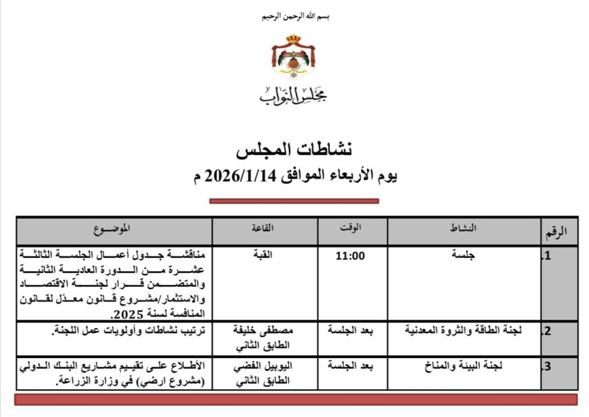 يعقد مجلس النواب، الأربعاء، جلسة تتضمن مناقشة قرار لجنة الاقتصاد والاستثمار والمتضمن مشروع قانون معدل لقانون المنافسة لسنة 2025.