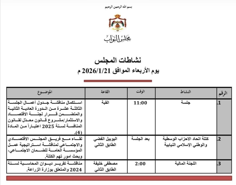 يواصل مجلس النواب، الأربعاء، مناقشة جدول أعمال الجلسة 13 من الدورة العادية الثانية والمتضمن قرار لجنة الاقتصاد والاستثمار مشروع قانون معدل لقانون المنافسة لسنة 2025 اعتباراً من المادة 4.