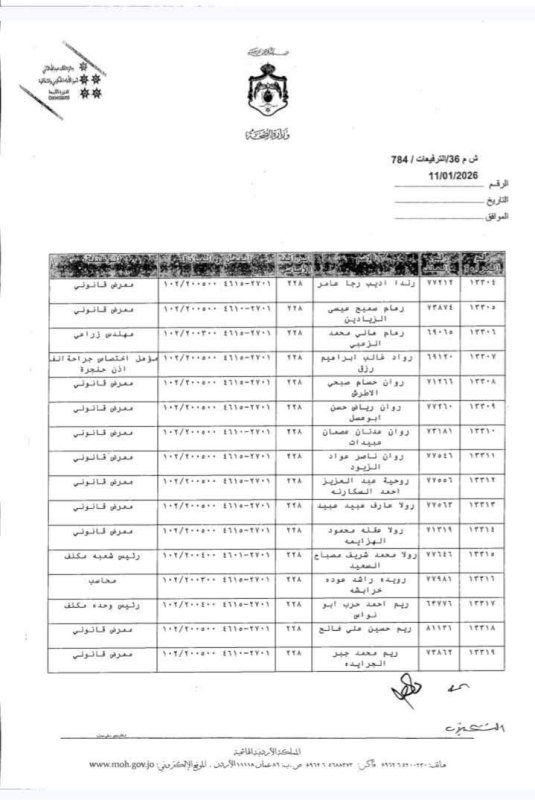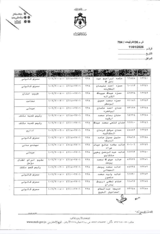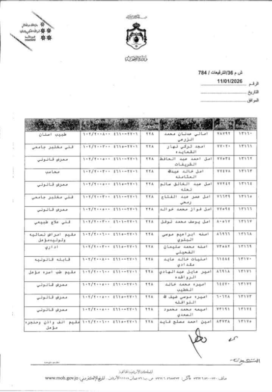 قرر وزير الصحة الدكتور إبراهيم البدور ترفيع الموظفين المدرجة أسماؤهم بالكشف المرفق الى الدرجة الثالثة الفئة الأولى وبراتب السنة الأولى المبين إزاء اسم كل منهم وجوبيا ليشغل الوظيفة والراتب والفصل والمادة المبينة.