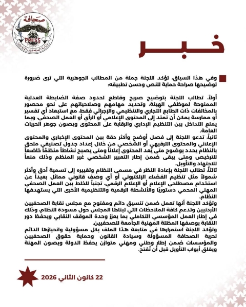 وتؤكد اللجنة أنها تعمل ضمن تنسيق دائم ومفتوح مع مجلس نقابة الصحفيين الأردنيين وتدعم كافة الملاحظات التي تبناها المجلس حول مسودة النظام، وذلك في إطار العمل المؤسسي التكاملي بما يعزز وحدة الموقف النقابي ويحفظ دور النقابة بوصفها المظلة المهنية الجامعة للصحفيين.
