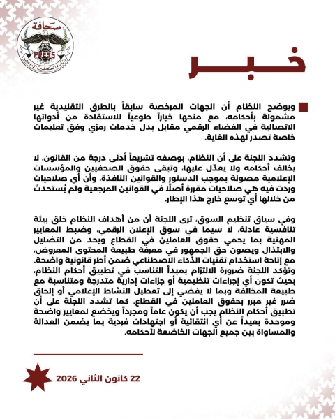 كما تبيّن اللجنة أن النظام يستند في أساسه إلى قانون الإعلام المرئي والمسموع وقانون المطبوعات والنشر، وأن مواده جاءت انعكاساً مباشراً لنصوص هذين القانونين دون استحداث التزامات أو قيود جديدة خارج الإطار التشريعي القائم.