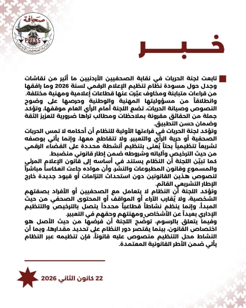 تابعت لجنة الحريات في نقابة الصحفيين الأردنيين ما أثير من نقاشات وجدل حول مسودة نظام تنظيم الإعلام الرقمي لسنة 2026 وما رافقها من قراءات متباينة ومخاوف عبّرت عنها قطاعات إعلامية ومهنية مختلفة.