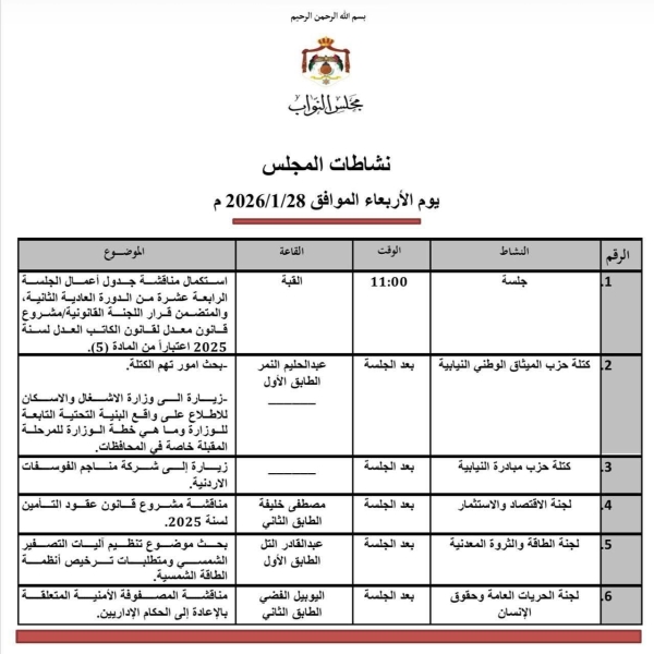 يواصل مجلس النواب، الأربعاء، مناقشة جدول أعمال الجلسة التشريعية الرابعة عشرة من الدورة العادية الثانية، المتضمن قرار اللجنة القانونية لمشروع قانون معدل لقانون الكاتب العدل لسنة 2025 اعتبارا من المادة (5).