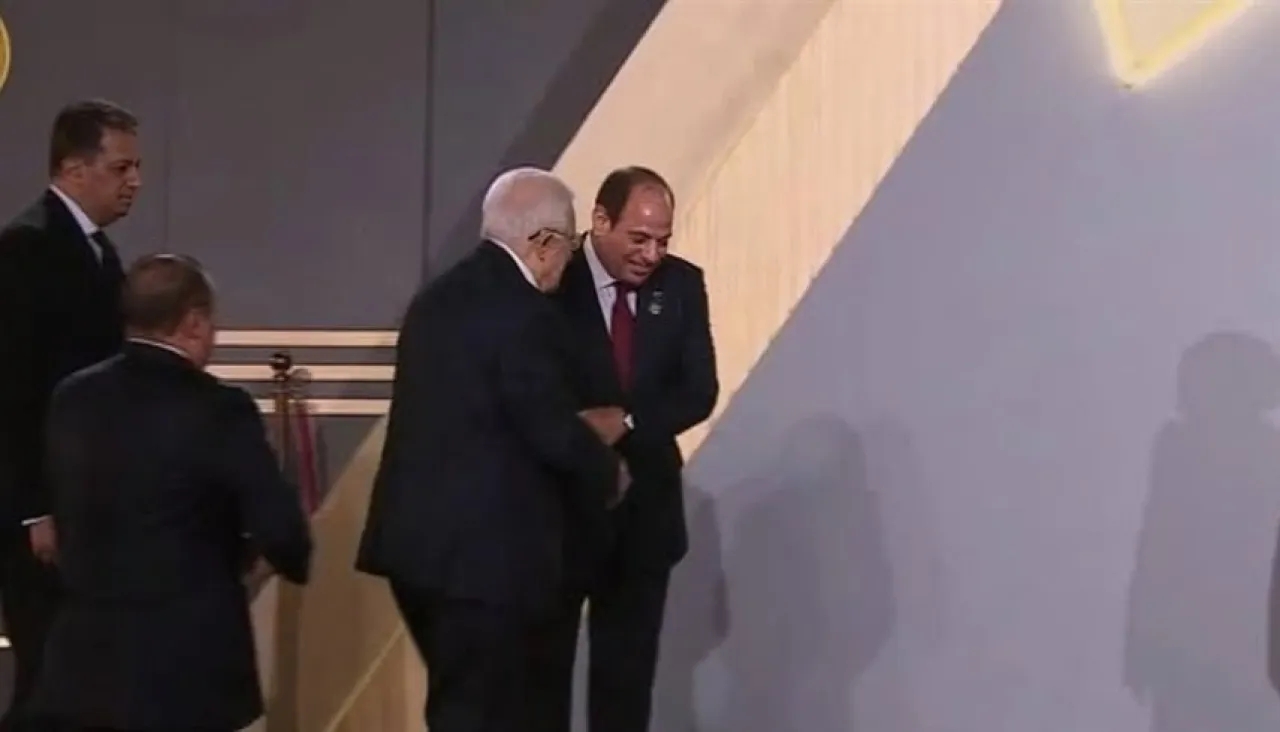 السيسي يساعد عباس على صعود الدرج في افتتاح المتحف المصري